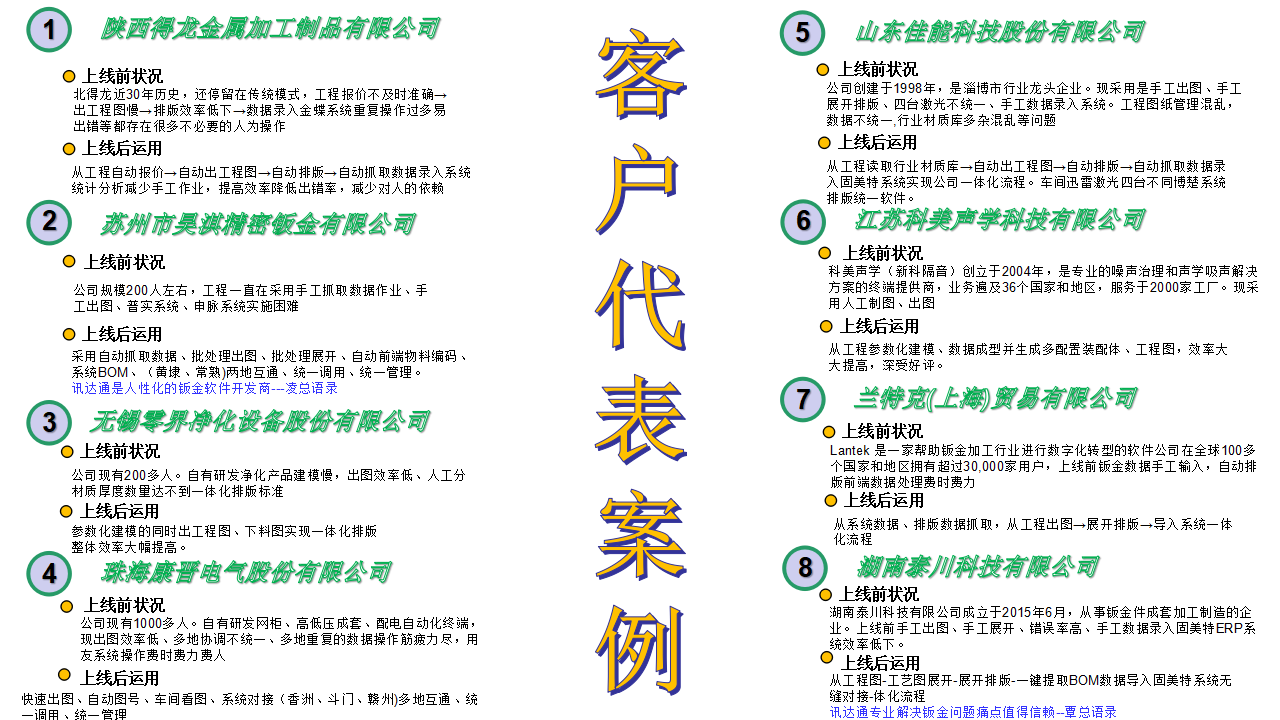 訊達(dá)通科技憑借獨(dú)到的理念、優(yōu)秀的團(tuán)隊(duì)、豐富的鈑金研發(fā)經(jīng)驗(yàn),以及完善的服務(wù)體系,將自身專(zhuān)業(yè)的鈑金軟件優(yōu)勢(shì)同客戶(hù)的實(shí)際情況與需求相結(jié)合,幫助客戶(hù)的在商業(yè)鈑金市場(chǎng)環(huán)境中保持競(jìng)爭(zhēng)優(yōu)勢(shì),取得非凡成就。